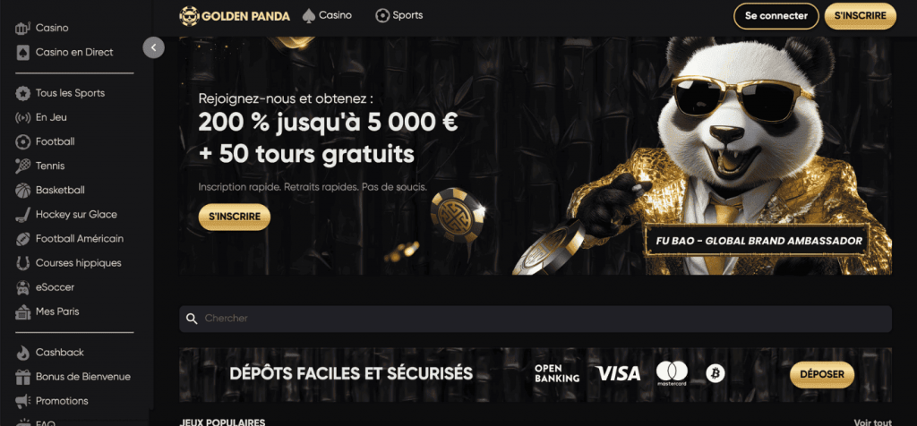 Golden Panda Casino s’est rapidement imposé comme une destination incontournable pour les joueurs modernes, mêlant une esthétique soignée autour de sa mascotte « Fu Bao » à une technologie de pointe. Ce site se distingue particulièrement par sa double casquette : un casino en ligne riche de plus de 3 000 titres et un bookmaker complet couvrant aussi bien les sports traditionnels que l’e-sport. L’interface, épurée et très réactive, a été pensée pour une utilisation optimale sur mobile, permettant une transition fluide entre les machines à sous et les paris en direct sans jamais sacrifier la rapidité d’exécution.