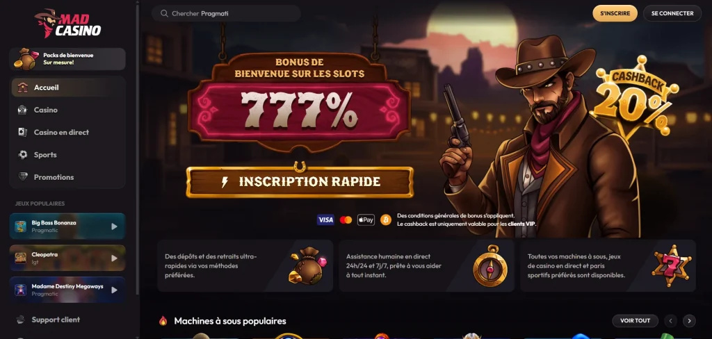 Mad Casino s’impose sur le marché des jeux en ligne avec une identité visuelle audacieuse et une énergie débordante qui captive immédiatement les joueurs en quête de nouveauté. Dès l’arrivée sur le site, on est frappé par une interface dynamique qui casse les codes traditionnels du casino pour offrir une expérience plus immersive et ludique. Ce positionnement « fun » ne cache en rien une plateforme robuste, techniquement optimisée pour garantir des temps de chargement records, que ce soit sur un ordinateur de bureau ou sur les derniers modèles de smartphones.